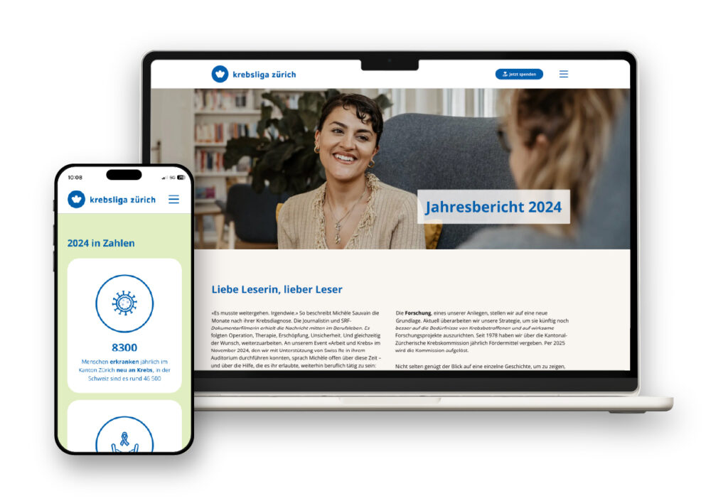 Mit dem digitalen Jahresbericht 2024 erreicht die Krebsliga Zürich ihre Zielgruppen auf neue Weise: modern, zugänglich und interaktiv. Dank klarer Struktur, responsivem Design und emotionaler Ansprache wurde der Bericht nicht nur informativ, sondern auch erlebbar. So lassen sich komplexe Zahlen und bewegende Geschichten effizient vermitteln – auf jedem Gerät.